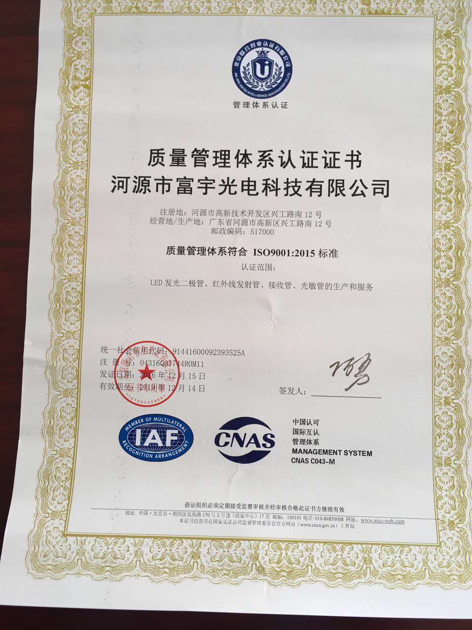 ISO9001:2015認證證書
